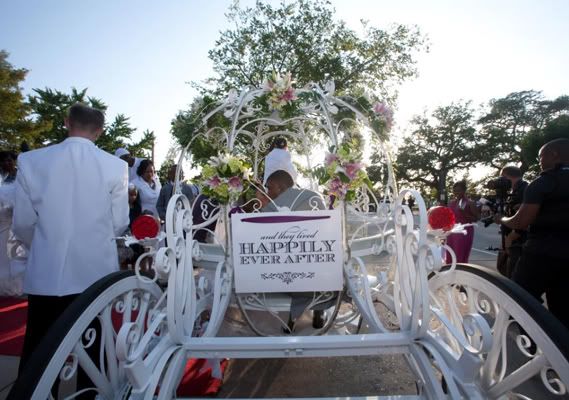 After the ceremony, the Michael Foster Second Line Band played as the couple and their 400 guests walked in a second line parade with mardi gras beads and umbrellas. And the newlyweds rode in a Cinderella-style carriage. Pics of the reception decor: