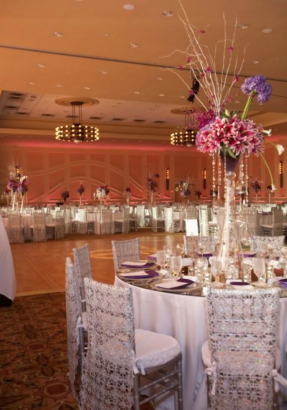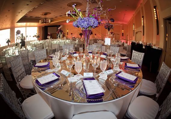 The reception was held in the Riverview Ballroom at the Hilton Capitol Center. Chiavari chairs had lace inspired silver mesh and sequin accent covers. And there were custom-cut mirrors by Custom Accents made for each table and topped with candles and crystals to create a beautiful ambience. The centerpieces, by Fleur du Jour, consisted of purple hydrangeas, dendobrium orchids, calla lilies, Phalaenopsis orchids and oriental lilies. For dinner, guests chomped on filet mignon, garlic shrimp, and crabcakes with potatoes and carrots. For dessert, brownie bites and bananas foster beignets were served. Yum!