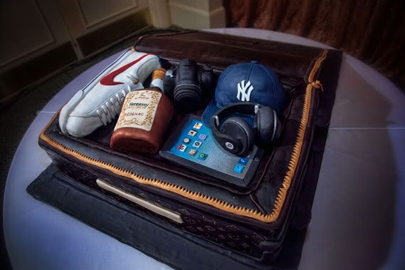 Look at this hand-painted groom's cake, by Cake Goddess. Audi described, "Inside were all of his favorite things like an iPad, sneakers and his New York hat. He couldn't believe it was real and kept saying 'how did y'all get my luggage?'"