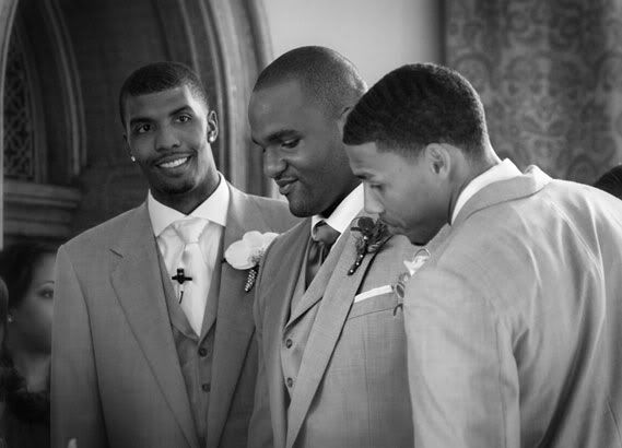 Tyrus' BFFs Garrett Temple and NBAer Glen "Big Baby" Davis were the best men who both rocked custom suits by Brown and Brown--two buttons, pique stitching and a European fit.