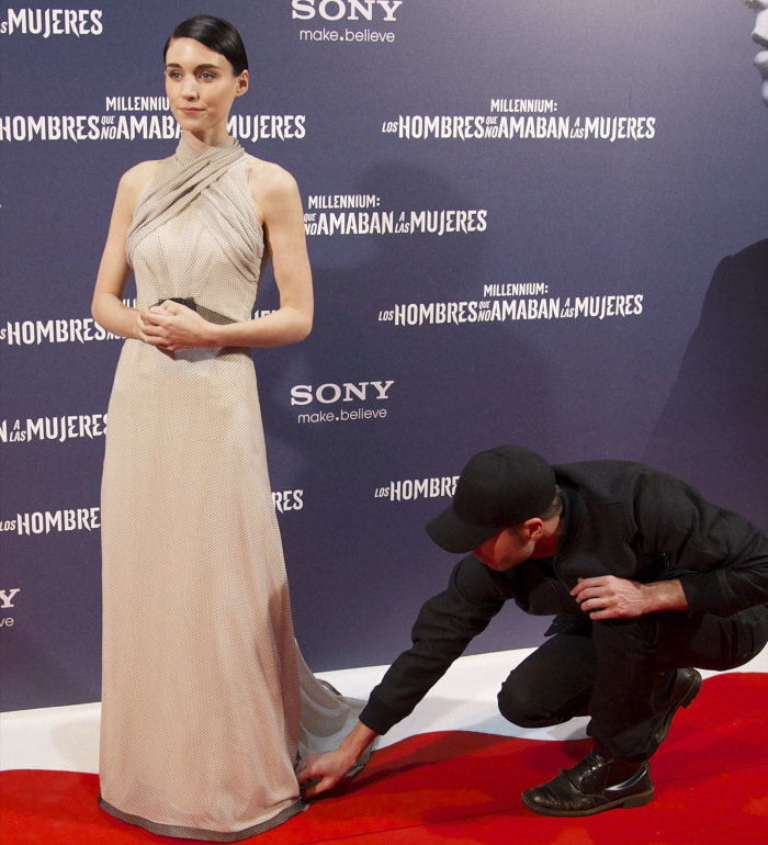 Rooney Mara in beigey Rodarte in Spain: please, get this girl a new stylist? Posted: 05 Jan 2012 04:30 AM PST In yesterday's links post, starring Rooney Mara as the corpse of your 1980s secretary, some of you yelled at me for "hating on" Rooney without reason. Those people seemed to ignore the fact that I praised her earlier in the day for her Paris premiere look, which was a cute, sparkly little Louis Vuitton dress that really suited her. The problem with Rooney is that she wants to be an "edgy" Fashion Girl, but her attempts, for the most part, are falling flat. There's the obvious problem with her bangs (trauma), but there's also a significant styling issue, especially with whoever is doing her makeup. She's pale and child-like (like Lisbeth Salander). I wouldn't mind if they did her all-goth, all the time. But they're trying to make her into, like, Chloe Sevigny circa 2000. And it's not working. So these are some photos from last night's Madrid premiere of The Girl With the Dragon Tattoo. Rooney (I almost called her Lisbeth there) wore this beigey Rodarte which… sucks. Let's just say it. This dress is awful. I can't even imagine this dress looking good on someone who wasn't an anemic with a Spock haircut. On Rooney, it just makes her look like a wispy streak of cat vomit. But that's not even the worst!!!!! Rooney and Daniel Craig are in Berlin today for the next leg of GWTDT's promotion, and Rooney decided to wear a BELLY SHIRT to the photo call. NO. JOKE. This is like a reject from Jennifer Aniston's wardrobe on Friends, circa 1995. For the love of God, can this poor girl get a decent stylist? I just feel bad for her now. I want to bring her home and buy her a pantsuit and some lipstick. |